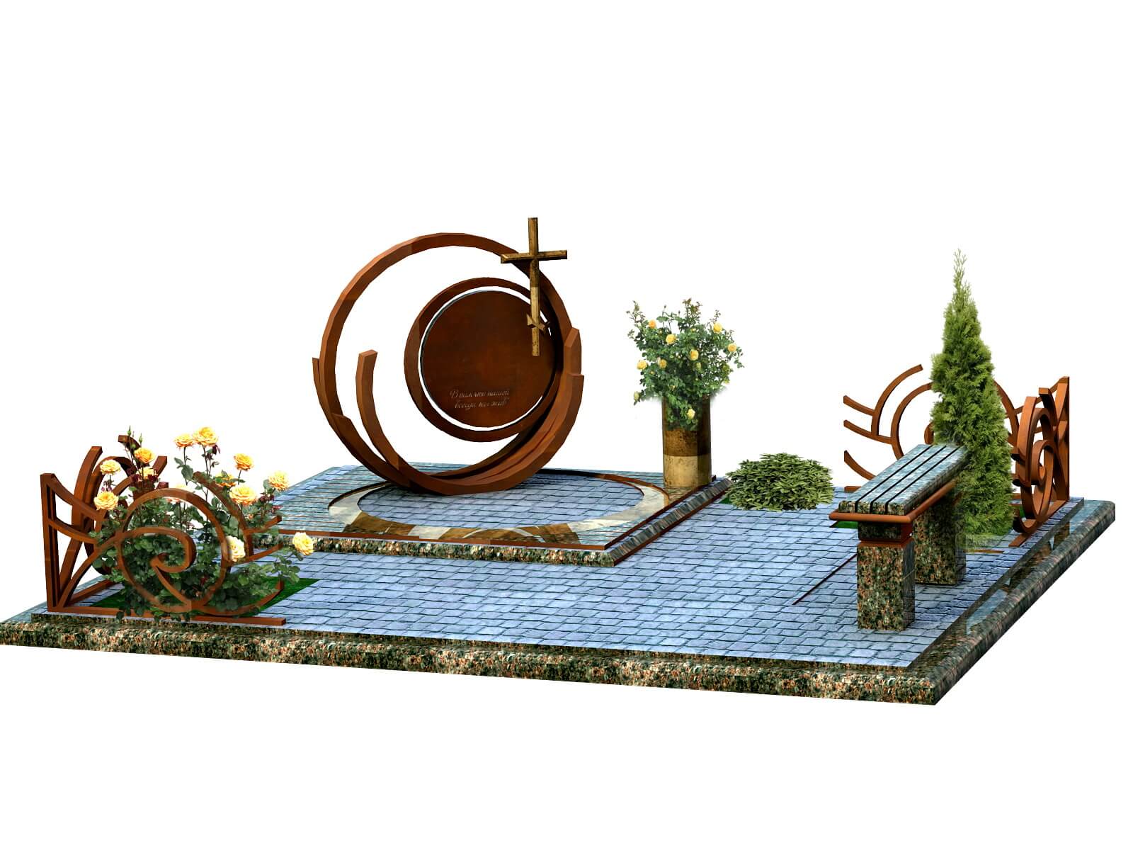 Оригинальное решение сочетания камня и металла. Есть такой особый состав металла, который покрывшись ржавчиной изначально далее ни подвергается разрушению. Идеально справляется с задачей материалов для памятников – долговечностью. В остальном место захоронения придерживается современных тенденций: наличие растений, как вечнозелёных, так и цветущих, обустроенный пол, не явная обособленность от окружающих объектов.