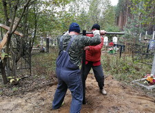 Нам же необходимо было привести территорию могилы в полный порядок. Приступая к работе, мы первым делом вкручиваем определяющие фундамент сваи.