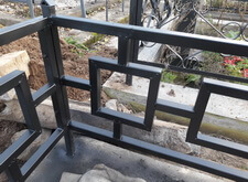 Возвращаемся на могилу. Подготавливаем оградку к покраске, зачищая её от старого покрытия. Параллельно устанавливаем подставку для памятника.