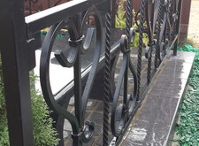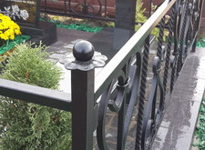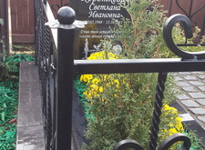 Покрасить ограду, так как чаще всего при установке ограды красят транспортировочной краской, которая приходит в негодность через год. Облицевать бетонный цоколь и бетон обрамляющий цветник. В данном случае для этого мы использовали керамогранит. Установили гранитные лавочку и столик. Посадили две туи и кустовые хризантемы в цветник. Заменили пластиковую вазу на гранитную. Уложили гранитную брусчатку на пол.