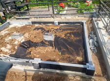 Подготавливаем территорию вокруг места захоронения к покрытию брусчаткой: ввариваем металлическую полосу и укрываем землю геотекстилем.