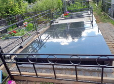 Устанавливаем надгробья. Справа располагается старый гранитный памятник, слева – композиция, изготовленная из полимеров. Скульптуры предоставлены клиентом и были сделаны в другой мастерской, сами они лёгкие, по текстуре и цвету похожи на камень.