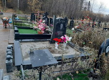 Завершающим этапом стала сборка оградки и укладка брусчатки. Ограждение мы создали из находившихся на могиле секций, кое где закрепив отломавшиеся навершия на разделительные столбики. Перед памятником мы установили гранитный цветник и две траурные урны, а по правую сторону от входа поставили заказанную клиентом лавочку, тоже изготовленную из чёрного гранита. Брусчатку мы замыли водой, одновременно удаляя всю строительную пыль, образовавшуюся в процессе работы.