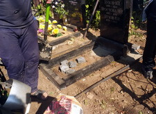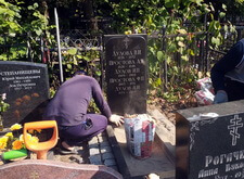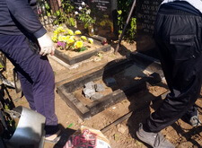 После того, как памятник был отодвинут, начинаем выравнивать его площадку. Досыпаем землю.